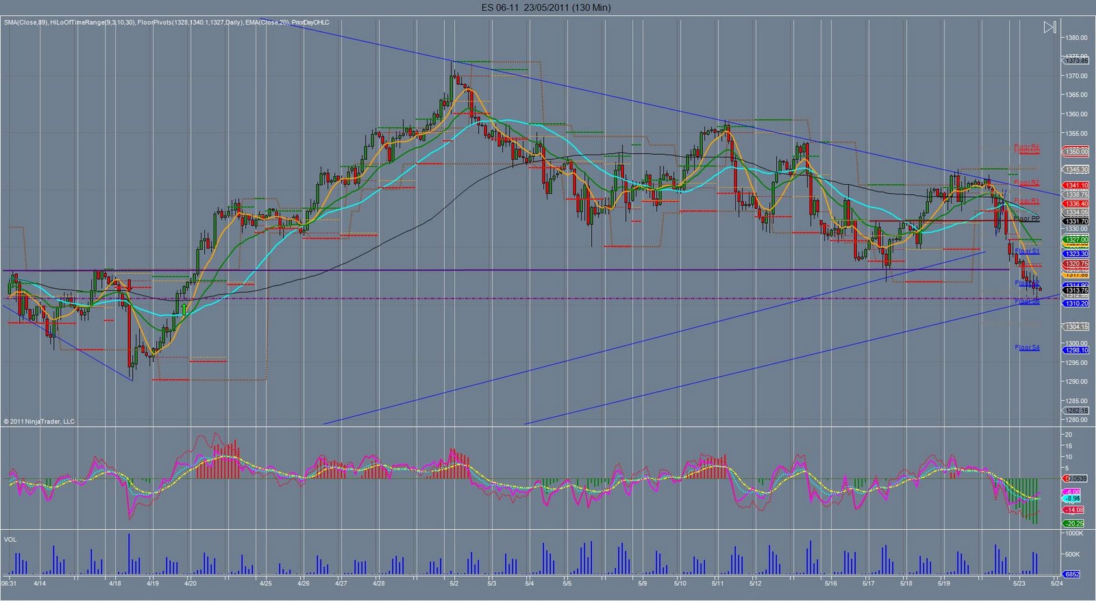 Converging trendlines and a retracement in the ES - too obvious? - Covering 1275 and shorting 1315 - +40. *edit* 10 points in I took 30% off... Stopped for the rest at evens plus a tick.